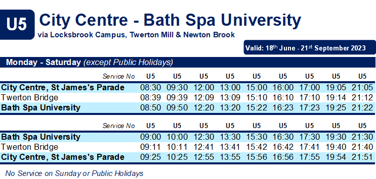 U5 timetable from 22 September 2023 - make sure to check the dates in the top right hand corner of each page to ensure you're looking at the relevant timetable.