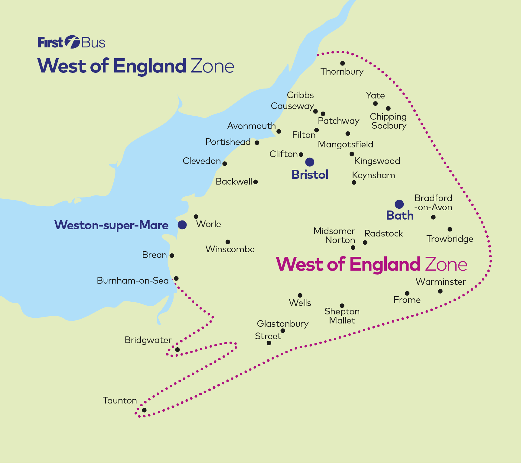 Our West of England Zone tickets allow unlimited travel on all First Bus and metrobus services* in Bristol, Bath and the surround areas including Clevedon, Chipping Sodbury, Weston-super-Mare, Frome and many more.