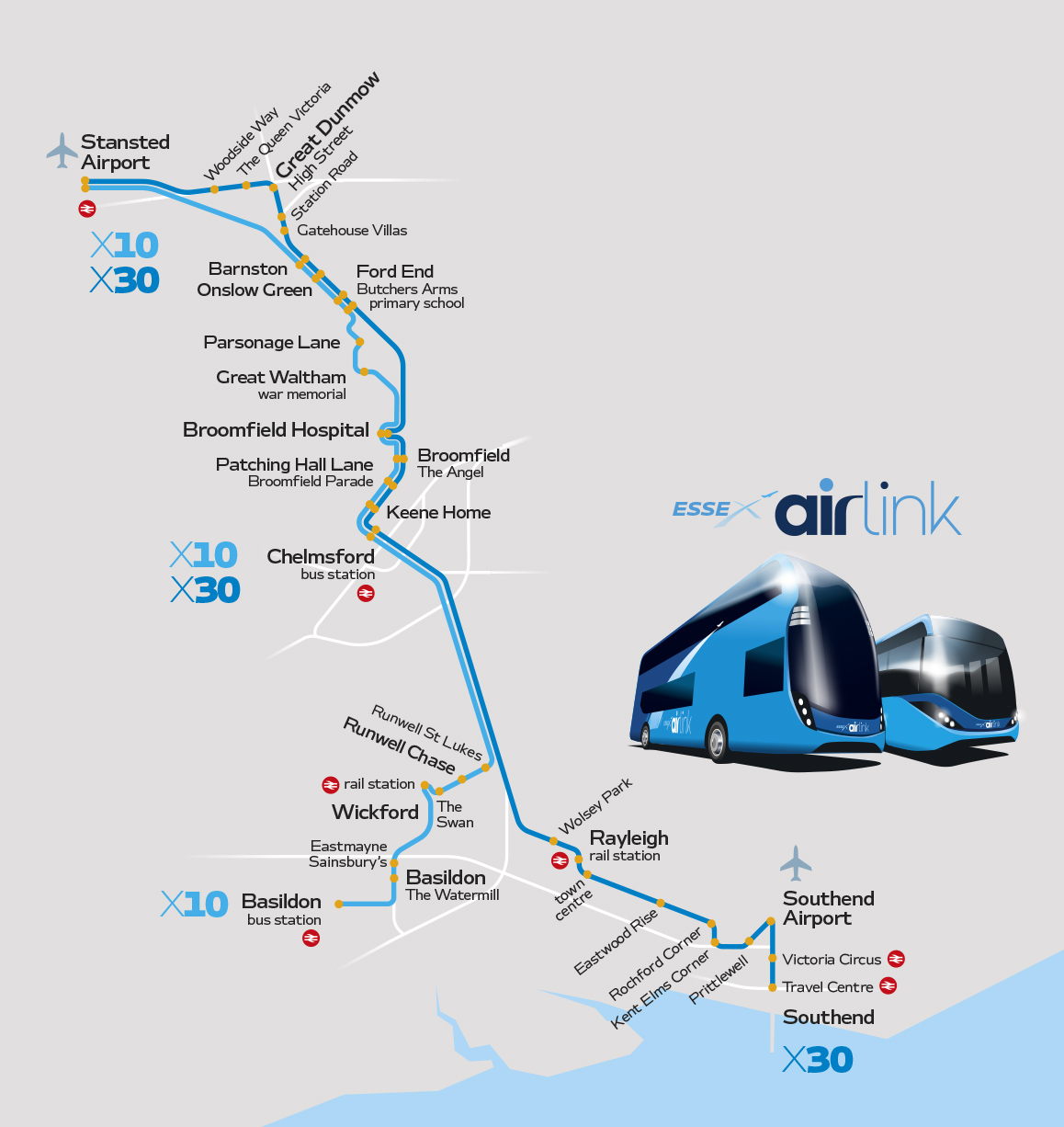 Service X10 is an easy and direct way to get to and from Stansted Airport, every day of the week from early til late. The service provides fantastic connections across Wickford and Chelmsford City Centre.