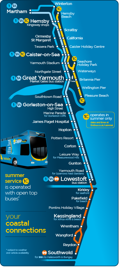 1 & 1A - Martham - Hemsby - Caister - Great Yarmouth - Gorleston - Hopton - Lowestoft